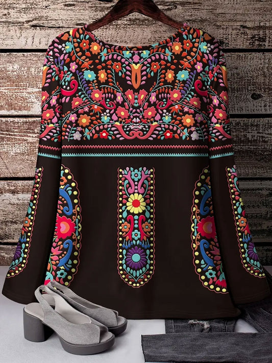 Top con cuello en V y mezcla de algodón estampado mundial de cuento de hadas estilo Boho para mujer