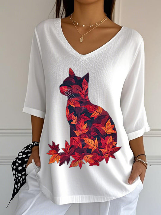 Casual otoño hojas gato impreso cuello en V Top de las mujeres