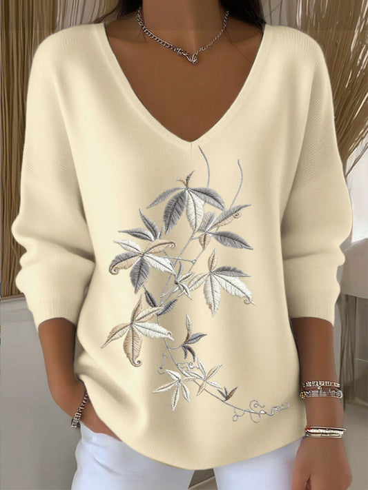 Suéter con cuello en V blanco de estilo europeo para mujer con bordado de hojas encantador, moderno y cómodo, fácil de crear miradas diarias