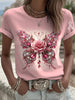 Camiseta casual con estampado de diamantes de imitación floral de mariposa para mujer
