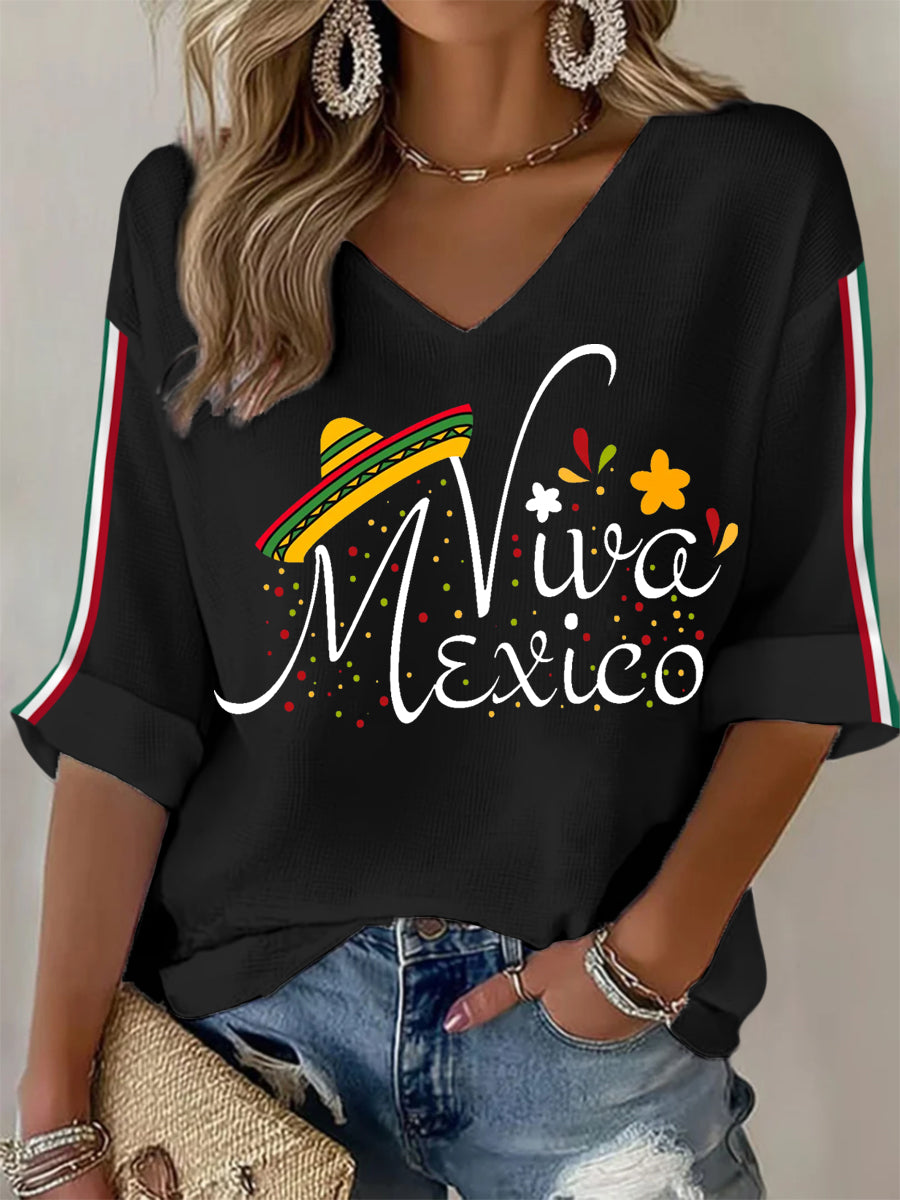 Camiseta de manga larga con cuello en V Viva México para mujer