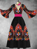 Vestido midi de manga de campana con cuello en V estampado floral de festival mexicano vintage